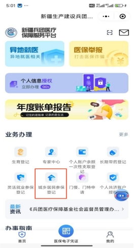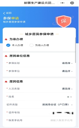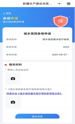 登录“新疆兵团医保APP”或“新疆兵团医疗保障局”微信小程序,进入城乡居民参保登记模块,填写基础信息并上传有效身份证件及《城乡居民基本医疗保险参保登记表》后,点击提交申请。