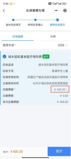 居民基本医疗保险由个人缴费、财政补助两部分组成,2026年度个人缴费标准为400元/人/年,父母一方在兵团参加医保的新生儿缴费标准为0元/人/年,财政补助标准不低于700元/人/年。