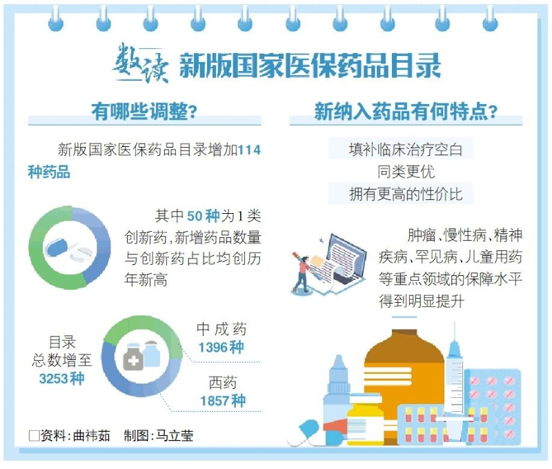 新版国家医保药品目录是国家医保局成立以来的第8次调整,新增114种药品,其中50种为1类创新药,新增药品数量与创新药占比均创历年新高,新纳入药品呈现三个显著特点:填补临床治疗空白,同类更优,或是拥有更高的性价比。肿瘤、慢性病、精神疾病、罕见病、儿童用药等重点领域的保障水平得到明显提升。