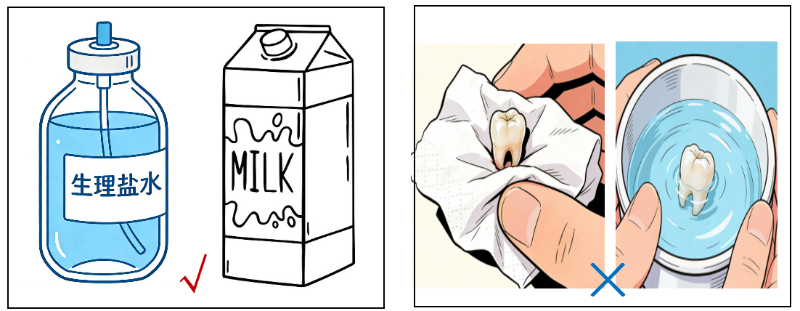 次选——湿润保存:若无法复位,必须将牙齿放在适宜的液体中保存。最佳介质是生理盐水;其次是牛奶;万不得已时,可让孩子含在舌下或腮帮处(需防止误吞)。特别警告:最糟糕的做法是将牙齿用纸巾包裹或泡在清水中,这会导致细胞迅速死亡。