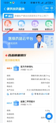 第二步:进入APP或微信小程序首页,在首页中部区域找到“药品云平台”点击进入。系统提供了找药品、找药店、找医院、智慧比价四大功能。