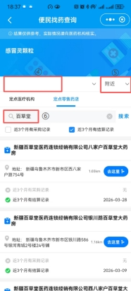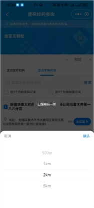 第四步:此外,平台支持切换到其他统筹区、配备机构距离的远近、查询指定配备机构,替您或家人查找指定位置附近的药品及配备机构。