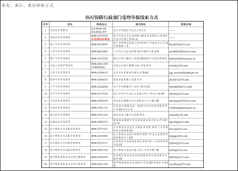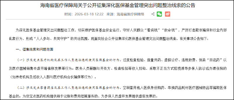 海南省医疗保障局关于公开征集深化医保基金管理突出问题整治线索的公告