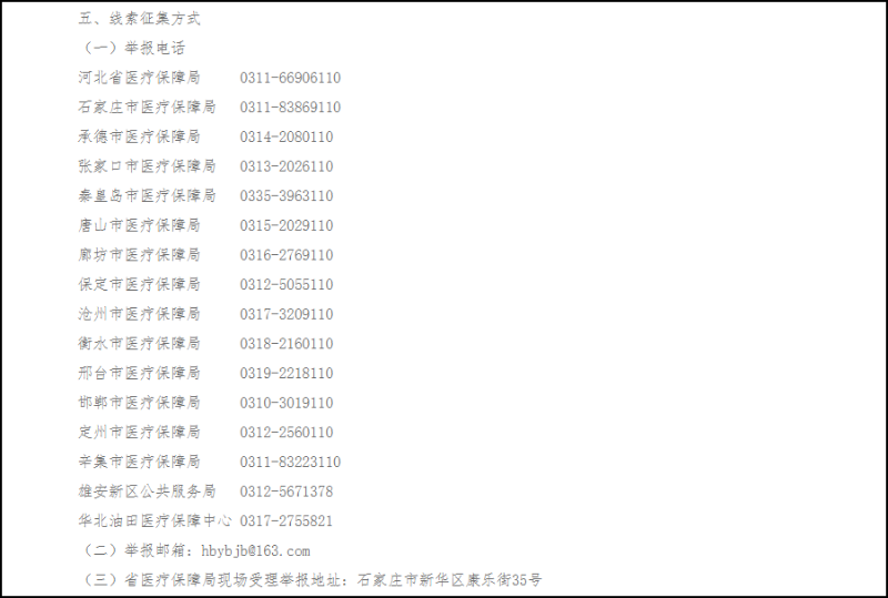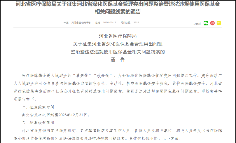 河北省医疗保障局关于征集河北省深化医保基金管理突出问题整治暨违法违规使用医保基金相关问题线索的通告