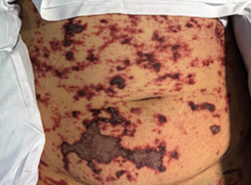 我解开小郑身上的衣物,细细检查:惊人的瘀斑遍布面部、四肢和躯干,部分区域的瘀斑看上去甚至像皮肤坏死了一样。