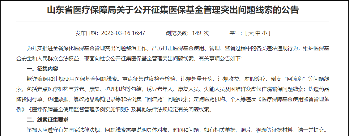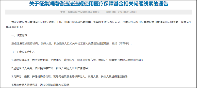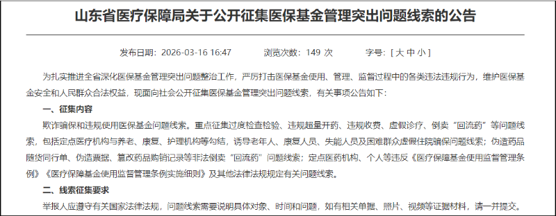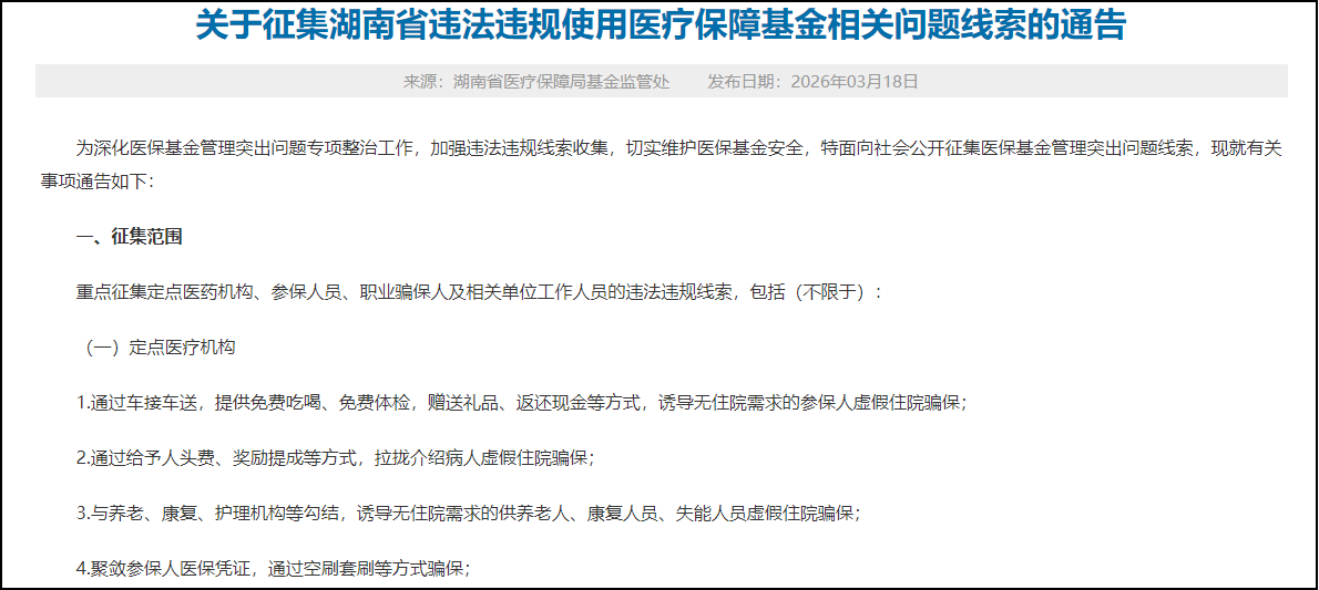 近日,为深化医保基金管理突出问题整治,充分调动广大人民群众参与医保基金监管的积极性、主动性,全国各地医保部门陆续发布公告,面向全社会公开征集违法违规使用医保基金问题线索,接受群众举报监督,举报线索经查证属实,将按规定给予奖励,最高奖励20万元。