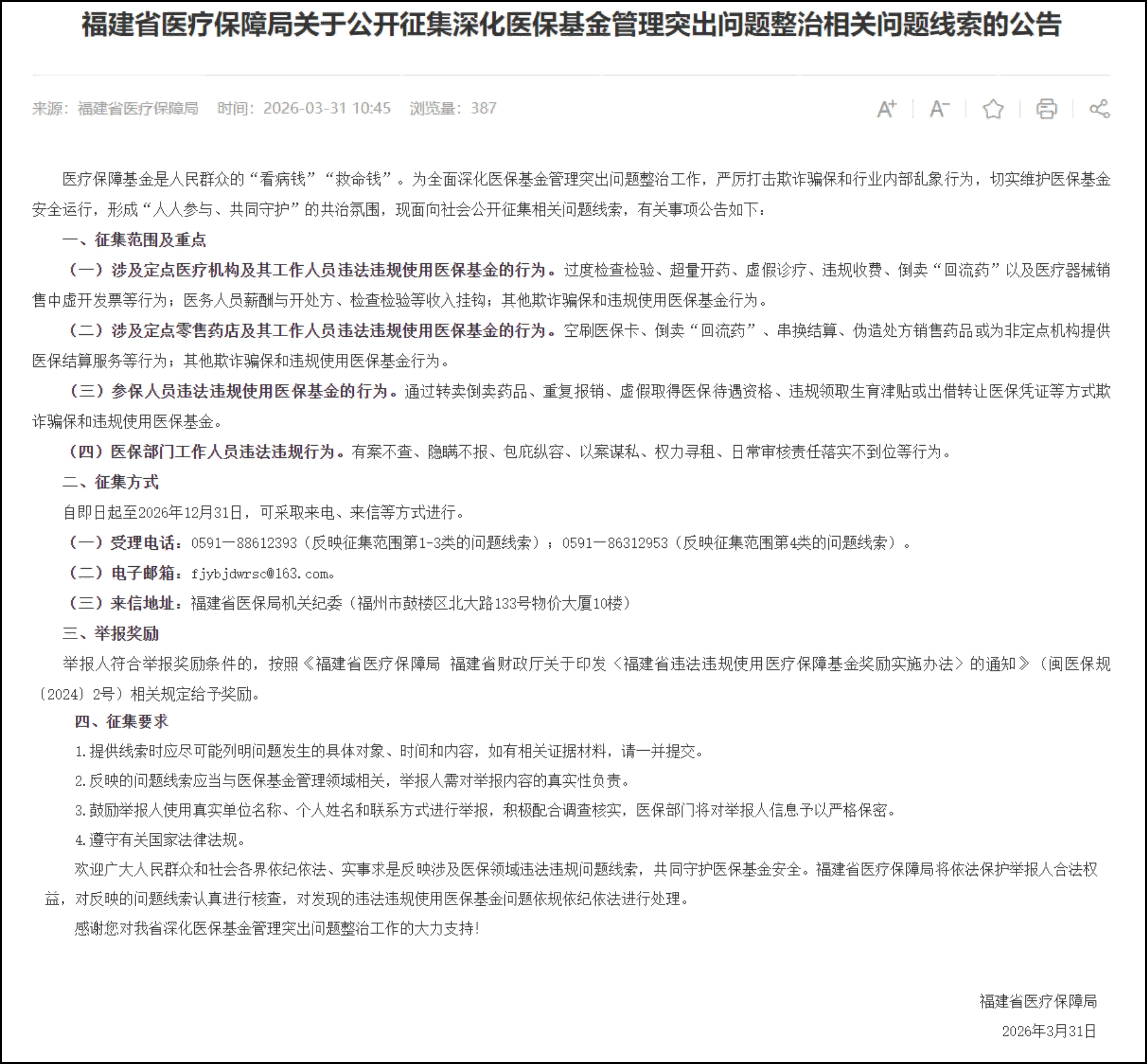 福建省医疗保障局关于公开征集深化医保基金管理突出问题整治相关问题线索的公告
